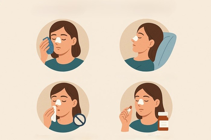 اقدامات شامل اجتناب از فشار بر بینی، مانند عطسه شدید یا دمیدن بینی، است. استفاده از دستگاه رطوبتساز (humidifier) رطوبت هوا را حفظ میکند و ریسک خونریزی را کاهش میدهد. اسپلینتهای خارجی یا داخلی برای تثبیت ساختار بینی باید تا زمان تعیینشده حفظ شوند. بررسی روزانه زخمها برای نشانههای عفونت مانند قرمزی یا ترشح ضروری است. رژیم غذایی نرم و مصرف مایعات فراوان برای جلوگیری از یبوست ناشی از داروهای ضددرد توصیه میشود، زیرا فشار هنگام اجابت مزاج میتواند تورم را تشدید کند.